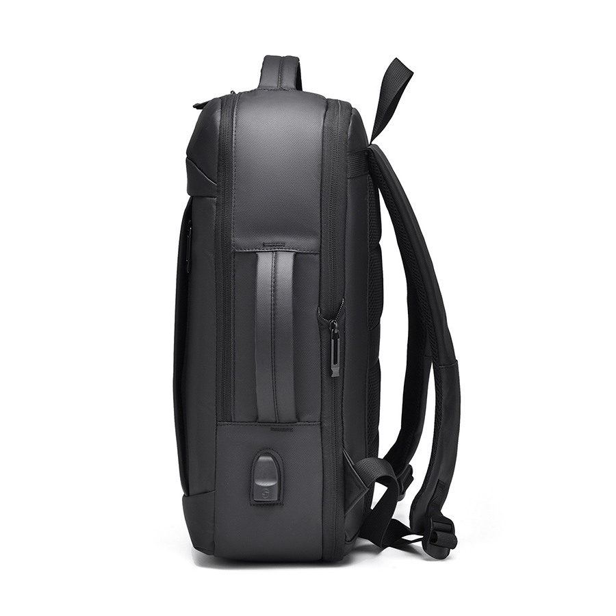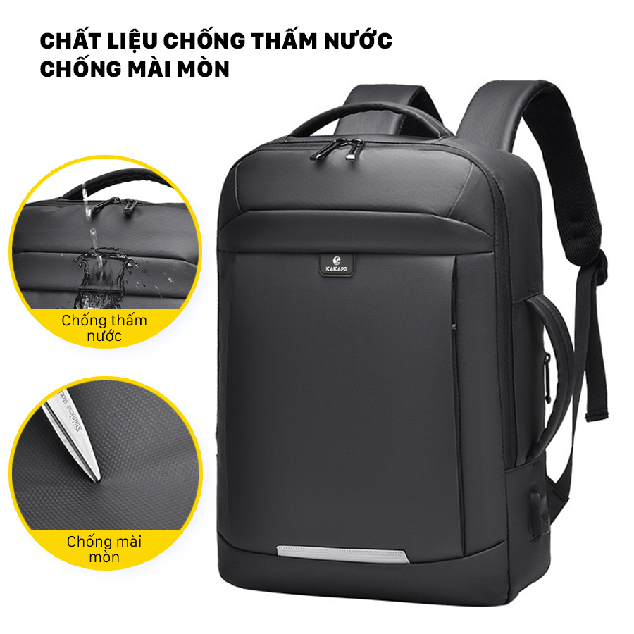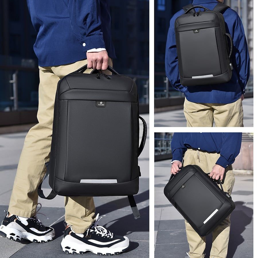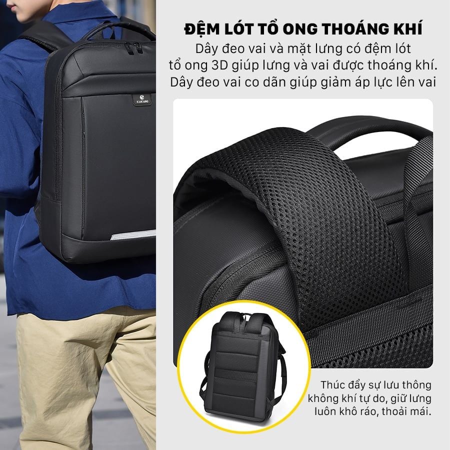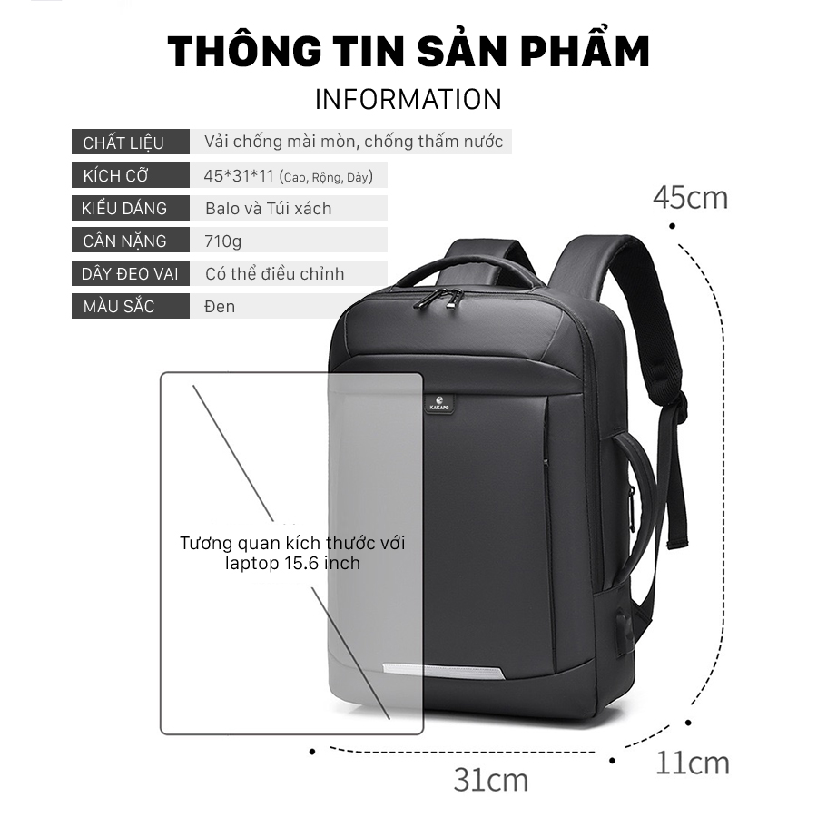 - Thiết kế tổng thể: Phong cách hiện đại – tối giản – nam tính, phù hợp đi làm, đi học, công tác, du lịch. Form balo đứng cứng cáp, giữ dáng tốt, không xẹp lép khi để đồ. Màu đen sang trọng, dễ phối đồ, không lỗi mốt.