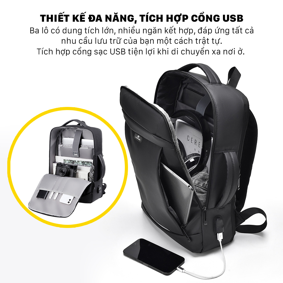 - Cổng sạc USB tiện lợi: Tích hợp cổng USB bên hông balo. Kết nối pin sạc dự phòng bên trong, tiện sạc điện thoại khi di chuyển. Phù hợp cho người thường xuyên đi xa, đi làm, công tác.