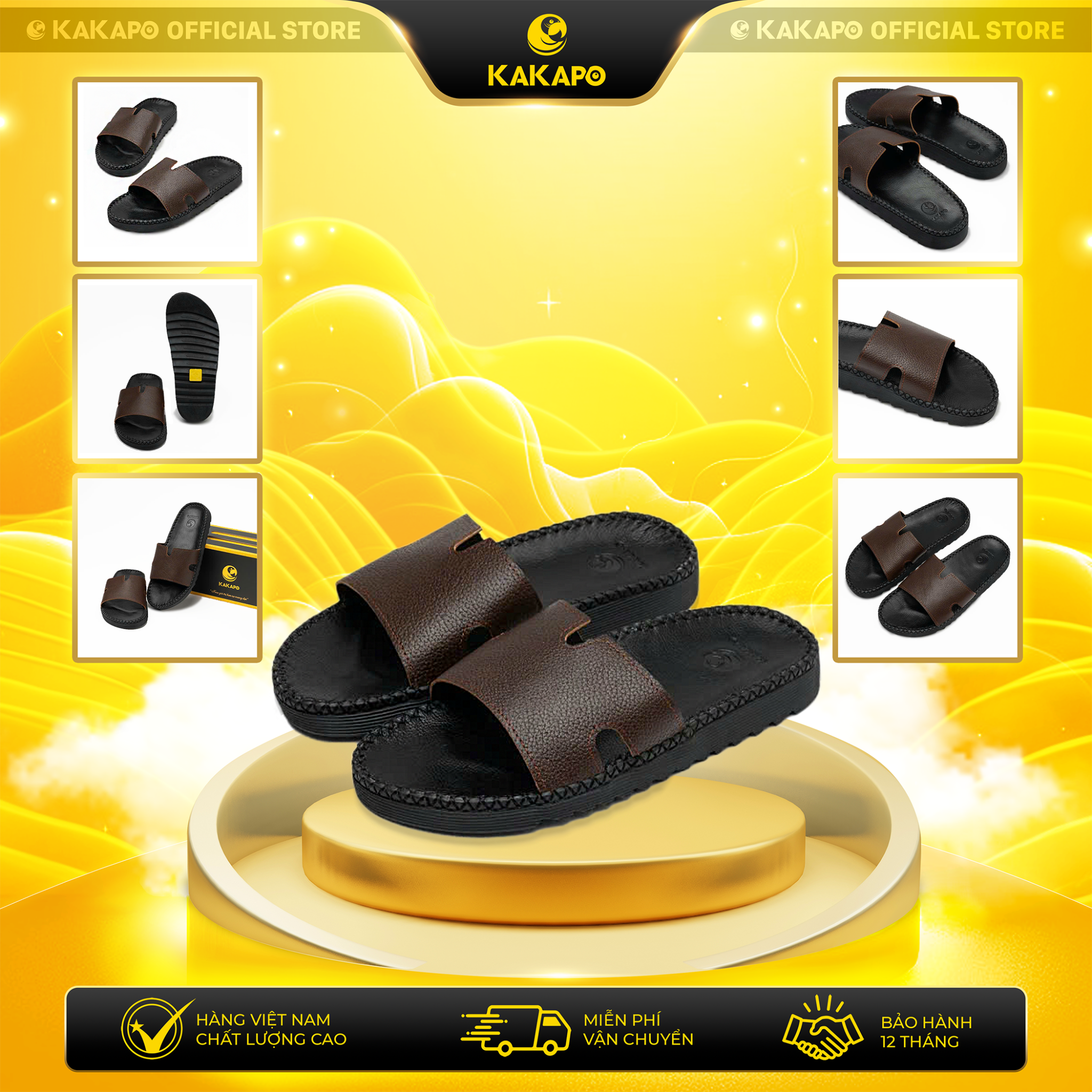 Dép nam quai ngang da bò thật KAKAPO DB001 Quai Nâu - Hộp đựng cao cấp kèm Bảo hành 12 tháng